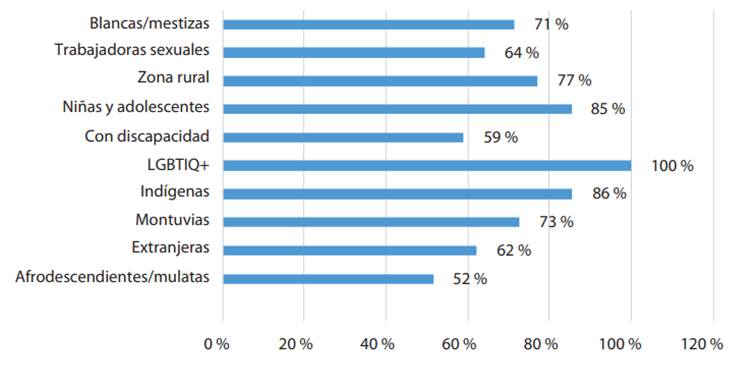 De acuerdo con la perspectiva interseccional, es interés de esta investigación observar si existen distinciones en el acceso a la justicia para diferentes grupos de mujeres. Así, se comparó la información antes expuesta, referente al acceso a la justicia, según los grupos identificados en la propia base de datos: mujeres mestizas o blancas, indígenas, montuvias, afrodescendientes, con discapacidad, LGBTIQ+, extranjeras, niñas y adolescentes, trabajadoras sexuales y de la zona rural.