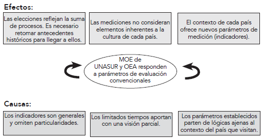 Finalmente, una vez analizados los parámetros de evaluación de la OEA y UNASUR, cabe señalar que las dos organizaciones internacionales hacen un esfuerzo por obtener información cuantitativa como cualitativa, con especial énfasis en los aspectos que regulan el proceso.