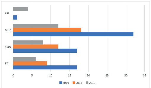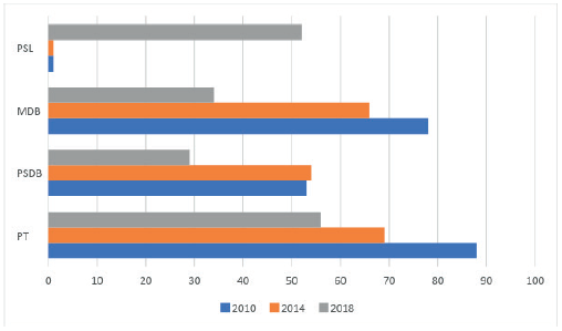 El gráfico 1 establece el número de representantes que obtuvieron el PT, el PSDB y el MDB, junto con el PSL en la Cámara de Diputados, con el propósito de analizar el crecimiento que tuvo este último partido en las elecciones de 2018, en comparación con la evidente pérdida de poder de los tres partidos tradicionales de Brasil.