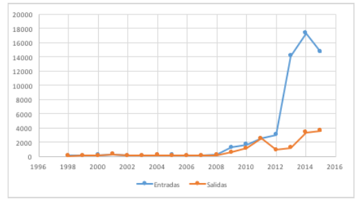 Tabla 1. Entradas y salidas de haitianos a Ecuador entre 1998-2015.