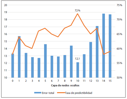 Después de realizar una gran cantidad de pruebas y comparaciones repetidas se tabularon los parámetros correspondientes y se seleccionó el error total de los modelos más óptimos, incluidos los que tienen diferentes parámetros de aprendizaje y distribuciones de entrenamiento / prueba, y se determinó que los modelos que mejor se ajustan tienen 28 nodos de entrada, 1 capa oculta, 8 o 10 capas neuronales ocultas, 1 capa de salida, y todos los modelos tienen su función inicial establecida aleatoriamente con el valor del parámetro inicial de [-0,3: 0,3]. Además, los modelos elegidos incluyen una función actualizable que representa su estructura topológica, una función de activación de características logarítmicas, una iteración máxima de 2000 veces y un error total que prueba la validez de los modelos. Se observó que el modelo con un factor de aprendizaje de 0,0079 y una distribución de entrenamiento / prueba de 50-50 tenía una ligera ventaja y, en consecuencia, fue elegido como el modelo que mejor se ajustaba a nuestros propósitos.