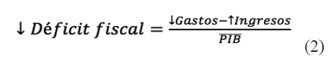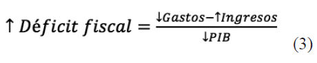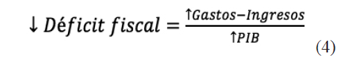 Por ello, un manejo fiscal apropiado y desarticulado de la reducción contable entre el contraste de ingresos y gastos, hasta puede permitir el incremento en el gasto público, y por tanto del déficit absoluto, mientras el PIB se incremente a una mayor tasa. Con ello, el déficit fiscal relativo se reduce (ecuación 4), cumpliéndose un objetivo deseable de la política fiscal por partida doble ya que a la vez se impulsa el crecimiento económico.