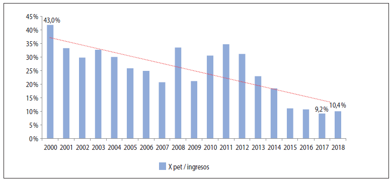 La dependencia de los ingresos del PGE en las exportaciones petroleras presenta una trayectoria decreciente en los últimos años, pero mantiene una fuerte relación con los precios internacionales del crudo.