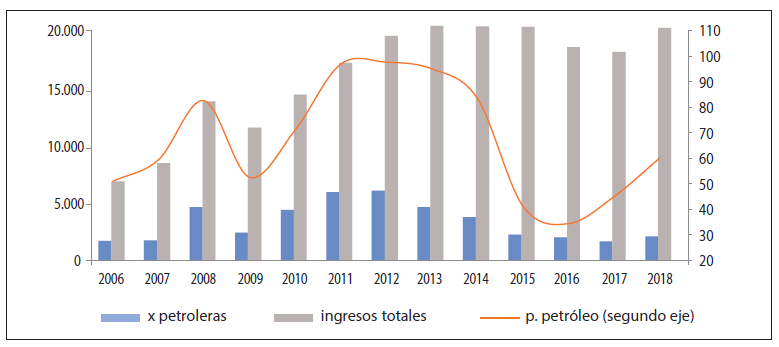 En resumen, la dependencia de los ingresos fiscales en las exportaciones petroleras del país es todavía importante, pero, a lo largo de los años, su relevancia ha ido decreciendo, al menos hasta 2018. Esta participación, cada vez menor, de los ingresos por exportaciones petroleras en la ejecución presupuestaria es importante en términos de la consecuente reducción de la dependencia en esta fuente, determinada por la volatilidad de sus precios internacionales por fuera de las capacidades locales de su control.