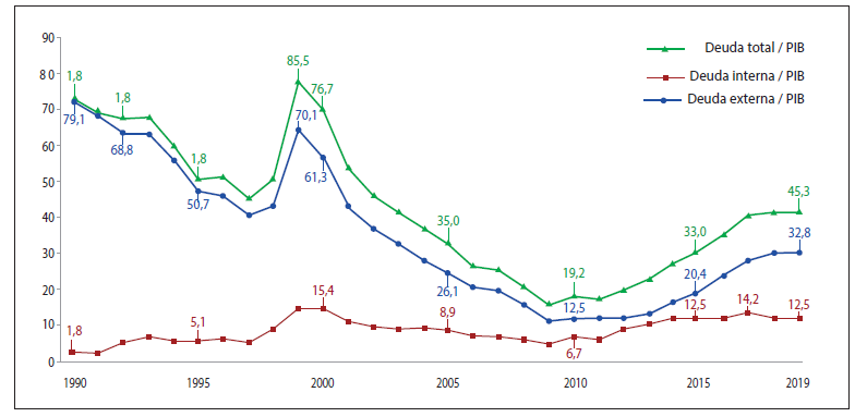 9 Se han tomado las cifras de la CEPAL como una entidad externa y neutral a las posiciones locales sobre la cuantificación y valores de la deuda pública ecuatoriana.