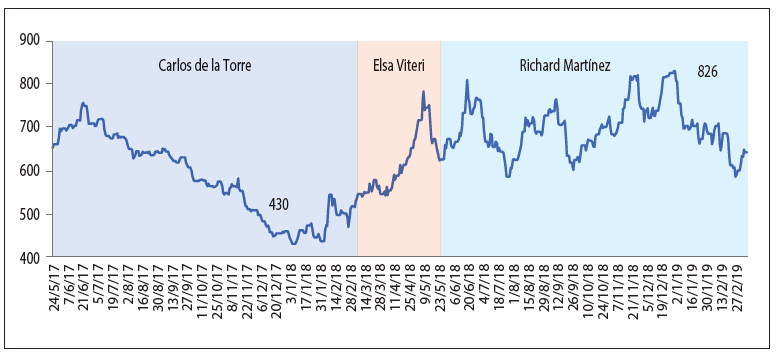 De varios registros del riesgo país (EMBI), se observa un primer período entre el 24 de mayo de 2017, día de inicio del período presidencial y del primer ministro, hasta marzo de 2018, cuando inició su gestión la segunda ministra, una marcada reducción de este indicador. En este caso, puede sostenerse el argumento generalizado de que los precios del petróleo (WTI) han contribuido en alguna medida a la reducción de la percepción de riesgo de los inversionistas internacionales respecto de la economía ecuatoriana, aunque existen elementos más robustos que se detallarán más adelante.