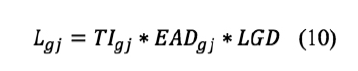 Donde: g = 1, 2, 3..., G grupos; Lgj = pérdida esperada del grupo g en el escenario j; TIgj = tasa de incumplimiento del grupo g en el escenario j; EAD gj = monto de exposición del grupo g en el escenario j; LGD = pérdida por el incumplimiento de los créditos que se supone no es estocástica. Cuantifica la porción de pérdida que el portafolio sufre en el caso de incumplimiento. En el caso simple, se tienen escenarios s en los cuales las contrapartes pueden incumplir o no con sus obligaciones. Para cada uno de los escenarios, la pérdida se definió por Clemente y Romano (2004):
