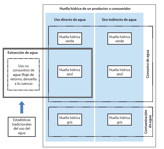 De manera esquemática, se puede representar igualmente a la HH de un productor o consumidor tomando en cuenta los diferentes elementos analizados anteriormente. En la figura 2, se ofrece una representación esquemática de los componentes que forman parte de la HH, en ella se muestra que los usos no consuntivos que forman parte del agua captada y que constituyen el flujo de agua que retorna a la cuenca, no es parte de la HH. Adicionalmente, se presenta que más allá de las medidas tradicionales del uso y extracción del agua que son contempladas en las estadísticas oficiales que miden la utilización del recurso, la HH de un productor o un consumidor incluye HH verde, la HH gris y el uso indirecto del agua.