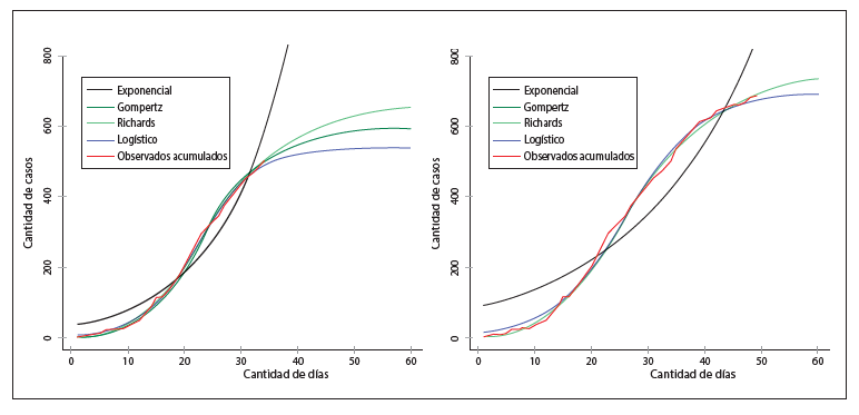 La figura 2 muestra la transición potencial desde un escenario con comportamiento logístico (línea azul) hasta un escenario con comportamiento exponencial (línea negra) y dos escenarios intermedios a partir de la serie de datos observados desde el día 1 al día 34. El crecimiento de casos diarios sigue un comportamiento con forma sigmoide desde el día 1 hasta el 49, ubicándose ya sea sobre la curva logística o la de Gompertz. En el panel inferior de la figura 3 las curvas de Gompertz y Richards coinciden en el pronóstico de los casos.