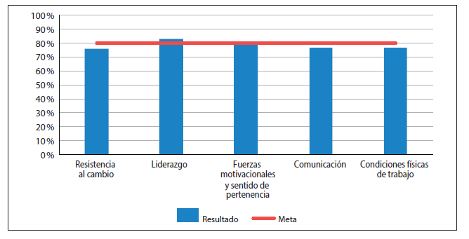 Por otra parte, las variables de comunicación y condiciones físicas de trabajo presentan un 77 % de aceptación y resistencia al cambio un 76 %. Dichas variables son las más representativas respecto a oportunidades para la cultura organizacional y en específico para el desarrollo de programas de continuidad de los servicios, atención y respuesta ante incidentes.