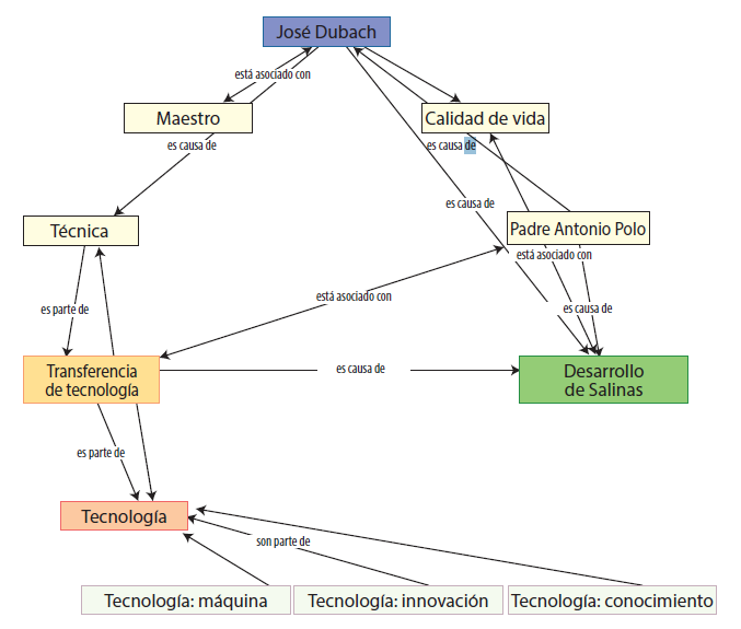 Parte de este análisis se desprende del trabajo desarrollado con el software Atlas.ti, con base en la revisión de documentos primarios, secundarios y las entrevistas a la población implicada. Para ello, se realizó una codificación abierta a través de los siguientes códigos: “José Dubach”, “Maestro”, “Calidad de vida”, “Técnica”, “Padre Antonio Polo”, “Transferencia de tecnología”, “Desarrollo de Salinas”, “Tecnología”, “Tecnología máquinas”, “Tecnología innovación” y “Tecnología conocimiento”. El código “José Dubach” tuvo la mayor recurrencia de citas seguido de “Calidad de vida” y “Tecnología”.