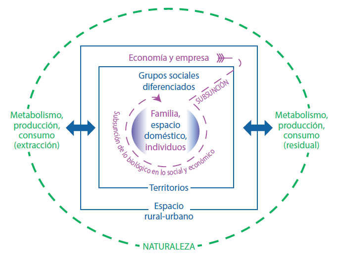 Así pues, el movimiento que deviene de la forma económica predominante tiene dos momentos: una subsunción de las dimensiones de producción y consumo desde la jerarquía general, y una subsunción de lo biológico en lo social que se concreta en el nivel individual y que expresa los procesos de enfermedad, fenotipos, genotipos y psiquis de los seres humanos: los embodiments. De acuerdo con las formas predominantes de producción y consumo de cada sociedad —y esto se relacionada directamente con economía y empresa—, existen expresiones en la naturaleza que reflejan nuestro intercambio orgánico con ella.