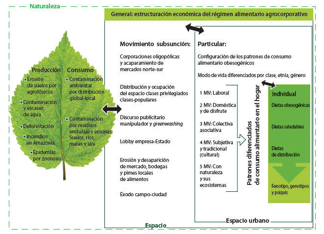 De acuerdo con Andrea Santos (2014, 11) “la modificación en un patrón de consumo alimentario supone cambios en los hábitos, costumbres, necesidades y referencias de los individuos, así como de modificaciones en la estructura productiva, comercial y de generación y distribución de la riqueza”. En contraposición con la teoría de soberanía del consumidor de la microeconomía ortodoxa, se plantea que estos cambios no se derivan únicamente de la demanda o las preferencias alimenticias de consumidores aparentemente soberanos. Se debe entender que, desde una jerarquía más amplia, la configuración de la oferta, existen procesos de condicionamiento en la producción y consumo de alimentos que mercantilizan las dietas y las adecuan a la lógica de valorización del capital corporativo, en el movimiento llamado como subsunción real de consumo, lo cual, repercute en el dominio del espacio para la circulación de los alimentos. Se sabe que el acaparamiento de los mercados globales sucede desde apenas 20 corporaciones a nivel mundial (Ottero, Pechlaner y Gürcan 2015).
