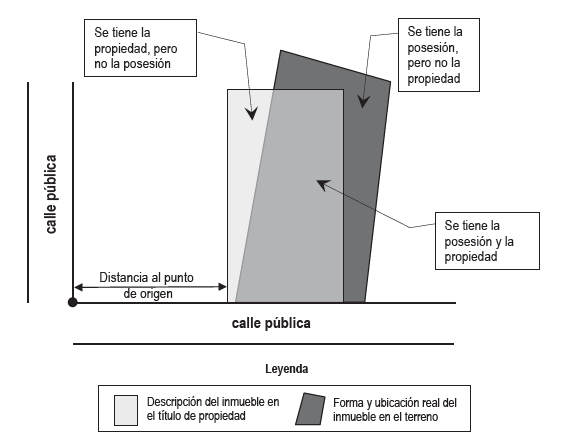 Desde el punto de vista catastral existen dos límites: el límite de la posesión efectiva, el cual es determinado por el uso del predio y es materializado por entes naturales (ríos, mar, entre otros) o antropológicos (paredes, cercas, entre otros); y el límite jurídico, que corresponde a una línea imaginaria que no puede ubicarse en el terreno sin una señal que la materialice. En este sentido el dimensionamiento de un predio consiste en la definición geométrica de ambos límites, siendo esta una condición imprescindible para poder integrarlo dentro del rompecabezas del territorio representado en la cartografía catastral. Un predio se considera físicamente dimensionado y precisamente ubicado cuando se conocen sus medidas lineares y angulares, y su posicionamiento, el cual puede ser relativo (no georreferenciado) o absoluto (georreferenciado). Paralelamente, para determinar el límite legal es necesario realizar el estudio de los títulos del predio en cuestión y de los títulos vecinos. La figura 2 muestra la interpretación gráfica del posicionamiento relativo de un predio, en la cual la realidad de campo –denominada en algunos países estado de hecho– no coincide con la realidad jurídica descripta en el título de propiedad (“estado de derecho”).