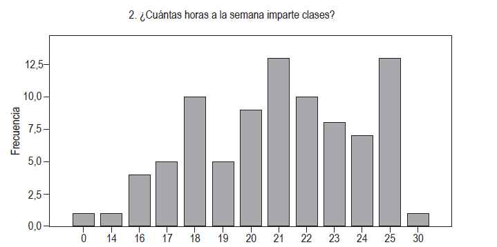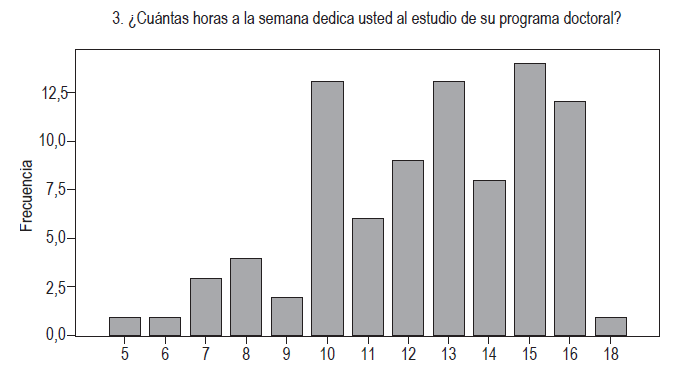 De los 87 encuestados el total respondió que se encuentra realizando un programa doctoral, de los cuales se identificó que la media de horas que imparte clases a la semana es de 20,90, con una alta incidencia de moda en 21 y 25 horas semanales. Cabe recalcar que muchos de los docentes encuestados