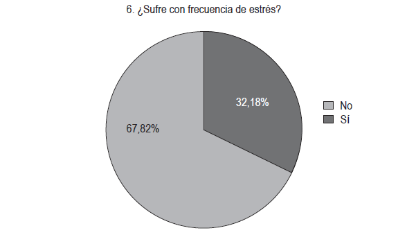 La figura 3 muestra la distribución porcentual de las respuestas de los participantes, y se observó que, de los 87 encuestados, 28 no sufren con frecuencia estrés, lo que representa aproximadamente un 32,20%; de los 59 docentes restantes respondieron que sí, lo que representa el 67,80%. La edad menor fue de 27 años y la mayor de 65 años. La edad puede ser un factor representativo en la frecuencia de estrés de los encuestados.
