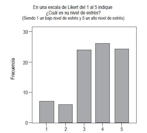 En la tabla 1 y figura 4 se observa la tabla de frecuencias y un gráfico de barras con las respuestas de los participantes; se observa que la media de la escala de Likert es de 3,62 con una desviación típica de 1,19. Se observa que 13 participantes ponderan su nivel de estrés entre los rangos uno y dos, lo que es un 14,90% del total de encuestados.