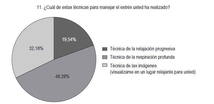 En las preguntas planteadas se mencionaron tres técnicas de reducción de estrés: a) respiración profunda, b) imágenes, y c) relajación progresiva.