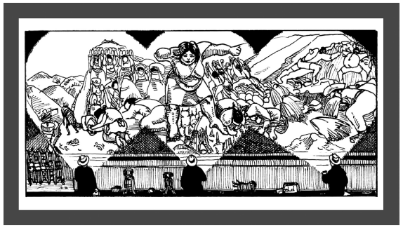 Por asunto de espacio, lamentablemente no puedo más que describir brevemente la estrategia metaficcional de Patinho, tanto a nivel de argumentación como de ilustración. Me limitaré a señalar dos asuntos: la negación de la negación como estrategia de resistencia a la dominación y el establecimiento del protagonismo femenino como forma de liberación.