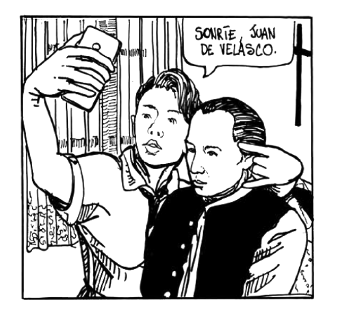 Lo que tienen en común, tanto el mural de Egas como el texto (“ficticio”) de Alexander, es la centralidad de la figura de la Gigante, una representación simbólica que gobierna, desde el horizonte utópico de ETM, toda la representación artística ecuatoriana. La tragedia de la pérdida del mural de Egas consiste en la pérdida y el ocultamiento del protagonismo femenino que preside el arte moderno en Ecuador. De alguna forma, esa centralidad, en la forma de la negación de la negación, aparece en uno de los paneles menos ostentosos de la novela, uno donde una de las “pillas”, el colectivo anárquico feminista que preside Kika, en espera de que los guardias del museo de cera de la ciudad duerman, para así perpetrar el hurto del mítico Calle 14 de Camilo Egas, mata el tiempo tomándose un selfie con la estatua de cera de Juan de Velasco, el autor, según Benjamín Carrión, de la “primera novela ecuatoriana” que es, a la vez, la primera Historia del Ecuador. Ese acto feminista de apropiación de la apropiación que hace Juan de Velasco del tiempo y el espacio de lo que en su tiempo fue la Real Audiencia de Quito, constituye, tal vez, el centro del ETM.