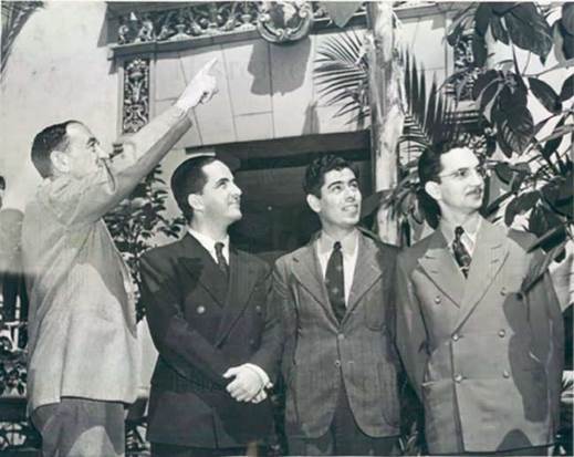 Figura 2. Foto de prensa de la Oficina de la Unión Panamericana. De izquierda a derecha: Leo S. Rowe, Ciro Alegría, Enrique Gil Gilbert y Cecilio J. Carneiro, ante el edificio de la Unión Panamericana, el 30 de abril de 1941. Al verso de la: “NEA” (National Endowment for the Arts). Colección personal.