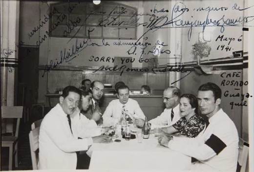 Figura 1. Comida con Thornton Wilder en el Café Rosado de Guayaquil, en mayo de 1941. De izquierda a derecha: Abel Romeo Castillo, Galo Galecio, Ángel F. Rojas, Alfredo Pareja Diezcanseco, Thornton Wilder, Alba Calderón de Gil y Carlos Zevallos Menéndez. Todos excepto Galo Galecio han firmado en la foto, probablemente tomada por Enrique Gil Gilbert, quien no se ve, pero ha firmado. Yale University Library, Digital collections, Archivo Thornton Wilder, https://findit-uat.library.yale.edu/ catalog/digcoll:3660951.