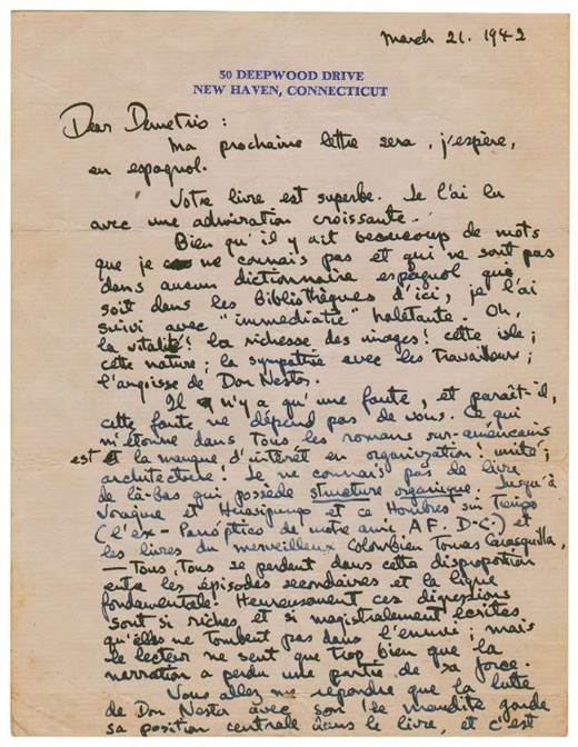 Alfredo Pareja Diezcanseco y Enrique Gil Gilbert no fueron los únicos miembros del grupo a los que Wilder conoció en Guayaquil. Marlene Dávalos nos dio un testimonio de su hermana mayor, Adda Teresa, que recordaba que su padre solía recibir en su casa a “este señor vestido todo de blanco”; y Anthony del Campo, hijo de Adda Teresa, nos dio generosamente una copia de dos cartas inéditas, del 16 de agosto de 1941 y el 21 de marzo de 1942, que atestiguan la relación amistosa de Wilder con Demetrio Aguilera Malta, una relación que ciertamente comenzó durante esta estancia de abril de 1941. 9 Estas dos cartas tratan principalmente de literatura. Wilder las escribió en francés porque, dice, su inglés era demasiado “complicado y enrevesado”, y su español era insuficiente.