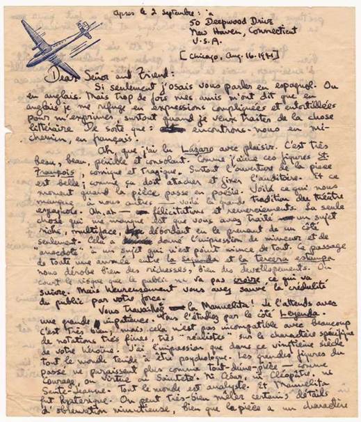 CARTA INÉDITA DE THORNTON WILDER A DEMETRIO AGUILERA MALTA, 16 DE AGOSTO DE 1941, 2 FOLIOS. COLECCIÓN PARTICULAR
