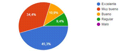 Fig. 1. ¿Cómo fue su experiencia con el EVA con respecto a las indicaciones de uso y anuncios? Elaboración: Propia. La Figura 2 representa la percepción sobre la calidad de los simuladores relativa a la evaluación en línea. Se observa que el 48,4% de los encuestados la considera excelente, el 28.1% muy buena, el 12.5% buena y el 10.9% regular. Ningún encuestado tiene una percepción mala para este componente.