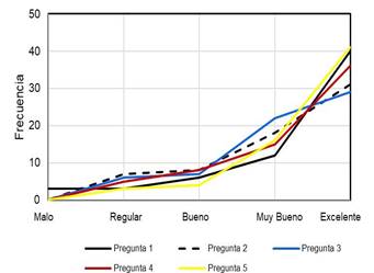 Fig. 6. Frecuencia de percepción de las cinco preguntas del cuestionario. Elaboración: Propia. Por lo anterior, de aquí en adelante nos centramos en discutir las diferencias de las percepciones de las preguntas en las categorías muy bueno y excelente donde existe un rango más amplio de votaciones. A partir de estas diferencias podemos hacer algunas inferencias, lo que no pasa en las categorías de malo, regular y bueno. Las preguntas 2 (Califique la calidad de los simuladores con relación a la evaluación en línea.) y 3 (¿Cómo califica la oportunidad de mejorar su rendimiento académico mediante el EVA?) son las que obtuvieron menos votaciones en la categoría de excelente con µ= 30 estudiantes; una diferencia notoria con respecto a la µ = 39 estudiantes de las preguntas 1, 4 y 5. Sin embargo, en la categoría de muy bueno las votaciones de las preguntas 2 y 3 obtienen los mayores puntajes, con µ= 20 estudiantes, la diferencia es menos marcada en las preguntas 1, 4 y 5 con µ= 16 estudiantes. Finalmente, las preguntas 2 y 3 en las categorías muy bueno y excelente tienen una agrupación diferente a las otras preguntas, por lo tanto, estas dos preguntas tienen una alta relación entre sí, pero obtienen cuantificación diferente en los votos de percepción si comparamos con las otras preguntas.