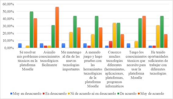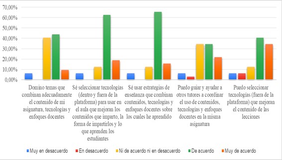 En cuanto a la dimensión del Conocimiento Tecnológico Disciplinar (TCK) existe un único ítem en el cuestionario. Los docentes manifestaron estar muy de acuerdo (40,63%) y de acuerdo (40,63%) con la aseveración: Conozco tecnologías (dentro y fuera de la plataforma) que puedo usar para comprender y elaborar contenidos sobre mi asignatura. Un 12,5% indicó una actitud neutral y el 6,24% restante declararon estar muy en desacuerdo. Estos resultados testifican los hallazgos de Colomer et al. (2018), quienes comprobaron percepciones bastante positivas acerca de los conocimientos tecnológicos conjugados con los disciplinares en un grupo de futuros docentes y tutores virtuales. Por otro lado, con respecto al único reactivo relaciona- do al Conocimiento Pedagógico Disciplinar (PCK): Puedo seleccionar enfoques docentes de manera eficaz para guiar el pensamiento y el aprendizaje de los estudiantes en mi asignatura, el 34,38% y el 18,75% respectivamente, manifestaron estar muy de acuerdo o de acuerdo con ello. Sin embargo, la mayoría (37,50%) presentó una postura imparcial, o en su defecto, estar en desacuerdo (3,12%) o muy en desacuerdo (6,25%). Estos últimos resultados llaman la atención pues el conocimiento pedagógico disciplinar corresponde al conocimiento fundamental que todo docente necesita para enseñar un contenido determinado. Por último, la Figura 6 muestra los resultados de la interrelación entre las tres dimensiones de conocimiento, es decir, el Conocimiento Tecnológico Pedagógico del Conte- nido (TPACK). En promedio, los porcentajes positivos disminuyen considerablemente con respecto a los otros co- nocimientos. De hecho, es la dimensión con la puntuación más baja. Así, por ejemplo, solo el 43,75% está de acuerdo con que domina temas que combinan adecuadamente el contenido de su asignatura, tecnologías y enfoques docentes. En forma similar, solo el 40,63% de los participantes está de acuerdo con poder seleccionar tecnologías (fuera de la plataforma) que mejoran el contenido de sus lecciones. Adicionalmente, cabe mencionar que un porcentaje considerable (34,38%) de docentes señaló indiferencia con respecto a sentirse capaz de guiar y ayudar a otros tutores a coordinar el uso de contenidos, tecnologías y enfoques docentes.