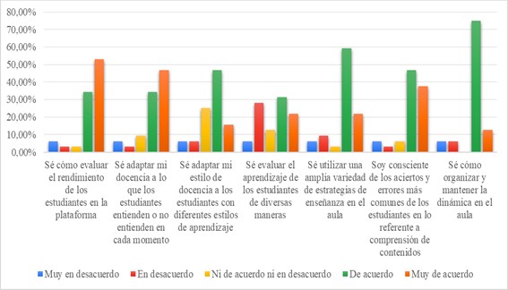 La Figura 2 describe los porcentajes relacionados con el Conocimiento Tecnológico (TK). Se observa que los encuestados respondieron en su mayoría positivamente a los reactivos de esta dimensión, no obstante, disminuye en lo que respecta al conocimiento acerca de diferentes tecnologías y tener oportunidades suficientes de trabajar con ellas. Este resultado corrobora los hallazgos de Morán F. L., Morán, F. E. y Albán (2017), quienes encontraron en una universidad pública ecuatoriana que los docentes tienen buenas apreciaciones sobre sus habilidades tecnológicas, aunque su conocimiento sobre herramientas, aplicaciones y plataformas digitales todavía es limitado. En lo que respecta al Conocimiento Pedagógico (PK), en la Figura 3 se aprecia una valoración positiva por parte de los participantes, pues los porcentajes más altos se agrupan en las categorías muy de acuerdo y de acuerdo. Sin embargo, llama la atención los resultados intermedios en torno a cuestiones sobre estilos de aprendizaje y evaluación; aspectos que responden a saberes fundamentales de la práctica docente. Estos hallazgos contrastan los resultados de Morán, F. L., Morán, F. E. y Albán (2017), quienes destacan en su estudio la capacidad de los tutores para utilizar estrategias que permiten evaluar el aprendizaje de los educandos y la destreza para adaptar su docencia de manera oportuna.