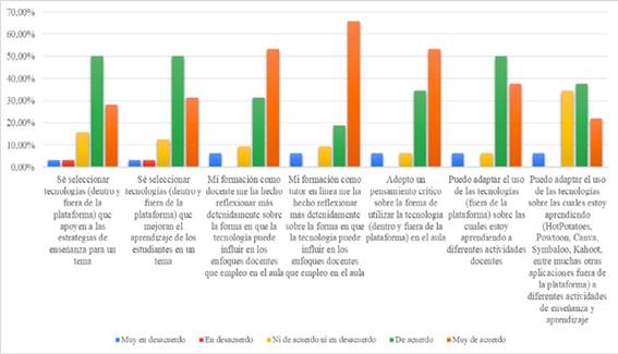 La Figura 5 representa los resultados obtenidos res- pecto al Conocimiento Tecnológico Pedagógico (TPK). La mayoría de los participantes afirmó estar muy de acuerdo y de acuerdo en lo que refiere a reflexionar críticamente sobre el uso de la tecnología y su influencia en la enseñanza. Si bien es cierto que en los otros reactivos también se observan puntuaciones altas, en el reactivo referido a adaptar tecnologías para el aprendizaje fuera de la plata- forma, como Symbaloo, Kahoot, Canva, entre otras, las percepciones positivas decrecen considerablemente.