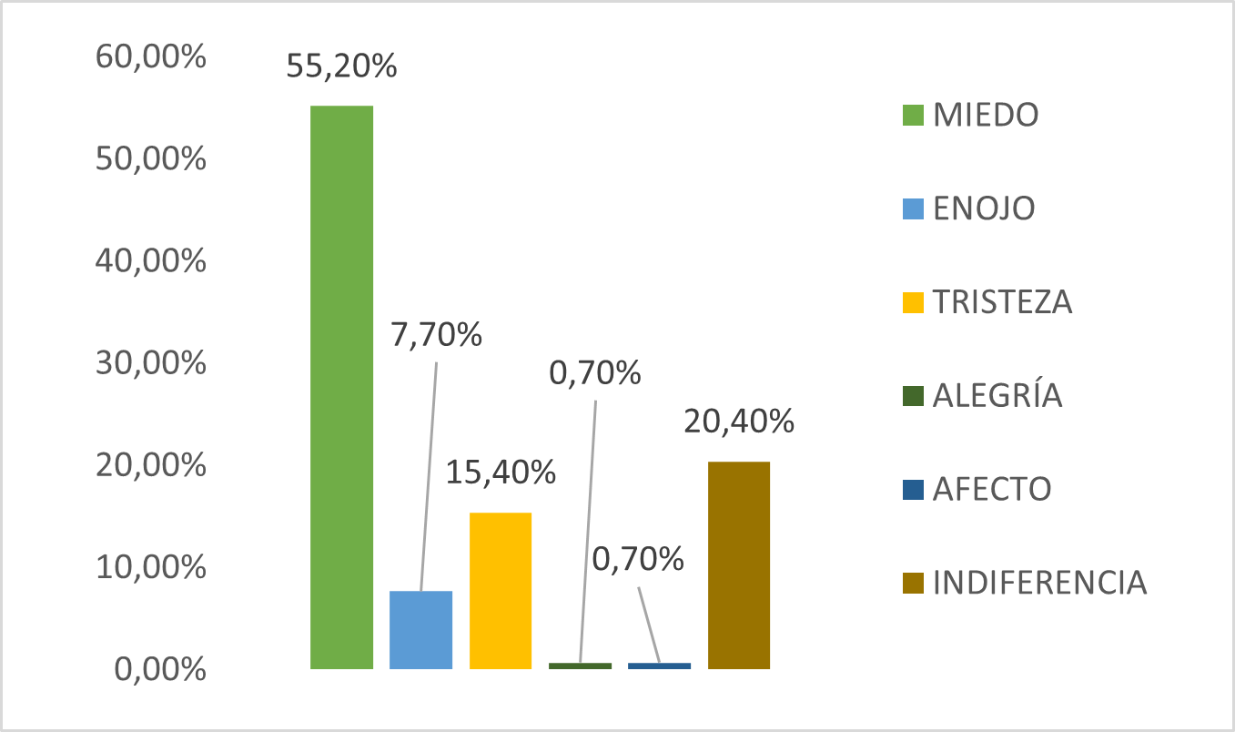 En la Figura 1 el interrogante de la encuesta iba sobre la emoción que sintió en el momento que se anunció que el coronavirus llegó a México, y más de la mitad de la muestra consultada (55.20 %) dijo que miedo. Obsérvese que se preguntó por emoción, ya que se trató de la reacción inicial (Damasio, 2006) como el fraseado señala, esto es el impacto primero sentido ante la noticia que las autoridades sanitarias del país anunciaran en el mes de marzo. ¿Qué es el miedo? De forma muy breve lo definiremos. Miedo, cuyo objetivo de supervivencia persigue la protección (Muñoz, 2009) biológicamente programado. El miedo advierte o anticipa amenaza, daño, riesgo o peligro físico o psíquico. El miedo […] es la reacción del organismo frente al peligro. Da la voz de alarma y acciona nuestros recursos para hacer frente a la adversidad. En estado de máxima alerta, el cerebro analiza la situación cruzando los múltiples datos. Organiza nuestra protección y elige la mejor actitud: huir, combatir o hacerse el muerto. Otra definición apunta: […] una reacción de la persona ante la percepción en el ambiente de una amenaza hacia la propia vida, que nos hace ir hacia la búsqueda de autoprotección, expresada normalmente en forma de huida. Si esta emoción no fuese adecuadamente experimentada, la persona no lograría cuidar de sí misma y estaría expuesta a los peligros de forma continua. Implica una sensación de desagrado, al mismo tiempo nos hace estar alertas y energéticos ante la posibilidad de huir. Agudiza los sentidos, pues su función es garantizar la protección, como se ha dicho. Si bien el miedo es la emoción mayoritaria no desconocemos el 20.40% de la indiferencia que se incluyó en la encuesta debido a que ejercicios previos sobre emociones y de distinta índole habían puesto en el foco a dicha, sino emoción, sí así nombrada cuando se aborda el tema. En todo caso, aquí se relacionaría con una actitud y con el estado de ánimo de apatía que surgirá en varias ocasiones en las narraciones estudiantiles presentadas en el apunto siguiente.