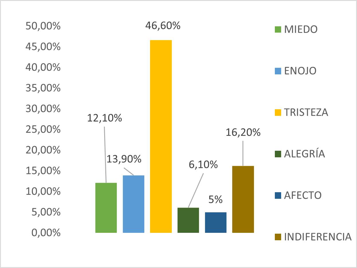 Una tercera cuestión fue el sentimiento también por su permanencia temporal (Damasio, 2006) del confinamiento al tener que estar en casa por la alerta sanitaria (Figura 3), y aquí es la tristeza de forma más amplia (46.60 %) la elección señalada, a bastante distancia de los demás porcentajes obtenidos, si bien el segundo es la ya mencionada con anterioridad indiferencia (16.20 %). Ante un shock, una pérdida, llega la tristeza, que además es mantenida y subrayada por la situación de encierro como más adelante se verá. Así las cosas, a nivel general, entre el estudiantado de este centro de educación superior, el miedo y la tristeza son las emociones y sentimientos mayoritarios apuntados. Un miedo que protege, pero que distorsionado también causa problemáticas mentales y una tristeza que introspecta, y que también puede llegar a ser disfuncional (Muñoz, 2009; Filliozat, 2007). El miedo exagerado desencadena el pánico desquiciante, la tristeza conduce a veces a la depresión y al desapego a la vida. Pero para expandir la mirada a continuación se exponen emociones y sentires, ahora dotados de descripción, explicación, argumentación y reflexión.