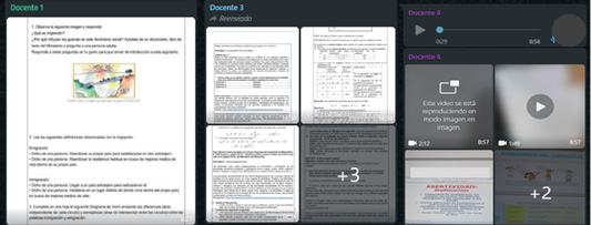 Las docentes reciben la presión de evitar la deserción estudiantil, en un contexto de padres con dificultades para participar en la educación remota. Esto las motiva a enviar las actividades de las fichas pedagógicas en formatos accesibles, como capturas de pantalla con las actividades diarias y documentos en Word o PDF. También se añaden videos y notas de voz para explicar contenidos e instrucciones a los estudiantes, como en la Figura 4.
