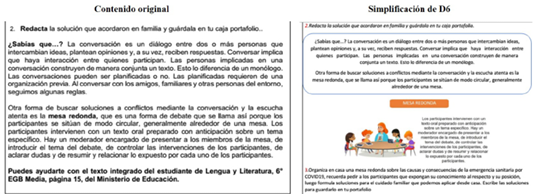 El Mineduc (2020e, p. 8) permite hacer cambios a las fichas pedagógicas siempre que no se desvíen de los objetivos curriculares. Las docentes hacen versiones adaptadas de las fichas pedagógicas y las envían a los grupos de WhatsApp. Se observan dos acciones: simplificar o añadir textos, contenidos e instrucciones. En ambos casos, existe una considerable modificación de la presentación visual de las fichas. Se añaden imágenes, esquemas y colores. Un ejemplo es la ficha adaptada de D6, como consta en la Figura 2.