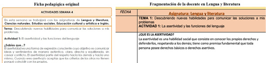 Los currículos proponen aprendizajes autónomos e interdisciplinarios para los estudiantes (Mineduc, 2020a; 2020b; 2020c). Una metodología para ello es el aprendizaje basado en proyectos, o logros de conocimientos interdisciplinarios que se alcanzan en cada ficha pedagógica (Mineduc, 2020d; 2020e). Sin embargo, las docentes suelen fragmentar el aprendizaje por asignaturas. Se observa en las instrucciones que entregan por WhatsApp. Por ejemplo, D1 menciona que una actividad pertenece a Lengua y Literatura. Las precisiones también aparecen en las adaptaciones a las fichas pedagógicas, como en la Figura 3, donde D4 aclara que una actividad corresponde a Lengua y Literatura.
