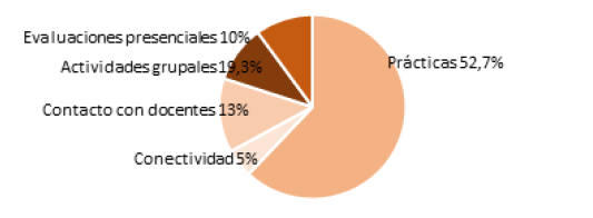 En cuanto a la principal temática sobre la cual consideran que debería trabajarse (Figura 2), el 52,7 % indicó que necesitan más prácticas, seguido de un 19,3 % que refirió a la necesidad de contar con más cantidad de actividades grupales. La tercera opción con frecuencia más elevada, con un 13 %, fue la de trabajar sobre la posibilidad de alcanzar un mayor contacto con los docentes.