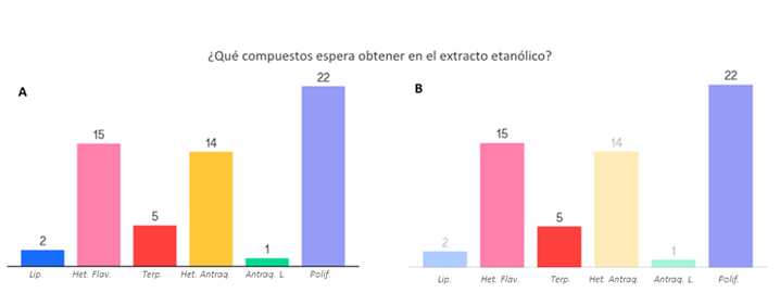 Fig. 2. Empleo de la plataforma Mentimeter para la discusión del tema de ‘Extracción de productos naturales’. A: Respuestas totales de los alumnos; B: Discriminación entre respuestas correctas e incorrectas (las incorrectas presentan color atenuado). Lip.: Lípidos, Het. Flav.: Heterósidos Flavonoides; Terp.: Terpenos; Het. Antraq.: Heterósidos Antraquinónicos; Antraq. L.: Antraquinonas Libres; Polif.: Polifenoles.
