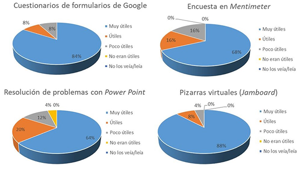 Luego de implementar las herramientas y plataformas digitales detalladas, se realizó una encuesta a los alumnos con relación a la utilidad de las mismas y sobre los aspectos positivos de las clases en el contexto virtual. Las encuestas se llevaron a cabo empleando formularios de Google, con las siguientes opciones de respuesta: muy útiles, útiles, poco útiles, no eran útiles, no los veía/leía.