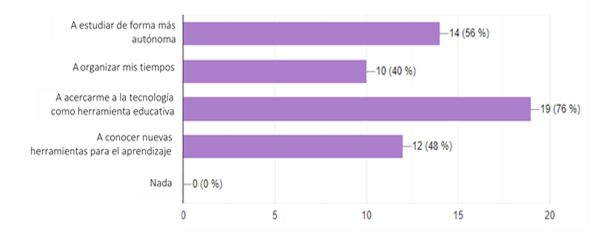 Otra de las preguntas formuladas a los alumnos al finalizar el curso, se refirió a los aspectos que consideraron positivos en la educación a distancia, a partir de esta situación de pandemia. En la Figura 4, se puede apreciar que un gran porcentaje de los estudiantes opina que han aprendido mayoritariamente a ‘estudiar de forma más autónoma’ y ‘conocer nuevas herramientas para aprender’, aunque también opinan que pudieron ‘organizarse los tiempos de estudio’ y ‘acercarse a la tecnología como herramienta educativa’. En este sentido, pudimos comprobar que, tal como postulan algunos autores (Alcibar et al., 2018; Astur et al., 2020; Barberá & Badia, 2005; Crosetti et al., 2021; Miguel Román, 2020; Pérez et al. 2020), el uso de las TIC promueve el autoaprendizaje, la transferencia de conocimiento y la comprensión, además del compromiso de los alumnos con su formación profesional. Es así que se ha conseguido un proceso de enseñanza-aprendizaje que no se ha visto limitado por el cambio del contexto educativo, ya que se han logrado abordar las tres fases típicas del aprendizaje cuando se trabaja con TIC: presentar la propuesta educativa, garantizar el alcance y el cumplimiento de los objetivos de aprendizaje (Barberá & Badia, 2005). De modo que, repensar la educación con la incorporación de la tecnología, tal como propone Chaparro Huauya (2021), nos ha permitido abordar los contenidos de nuestra materia en el contexto de pandemia.