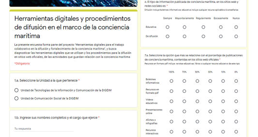 Este levantamiento de información se llevó a cabo desde el análisis de las páginas web oficiales de la Armada del Ecuador (http://www.armada.mil.ec), la DIGEIM, (http://digeim.armada.mil.ec) y redes sociales anexas. El análisis se enfocó en determinar si el tipo de publicaciones que se han generado evidencia el aprovechamiento de herramientas digitales y un enfoque hacia productos que fundamenten el trabajo colaborativo o al menos lo promuevan. Para ello se aplicó una encuesta online (Figura 7) a los funcionarios responsables de la Unidad de Tecnologías de la Información y Comunicación de la DIGEIM, además de la Unidad de Comunicación Social; la encuesta buscó determinar aspectos como: el tipo de información y la frecuencia de publicación, la organización con base en categorías o etiquetas, las herramientas digitales que se están utilizando y las redes sociales que se emplean en complemento a las páginas oficiales.