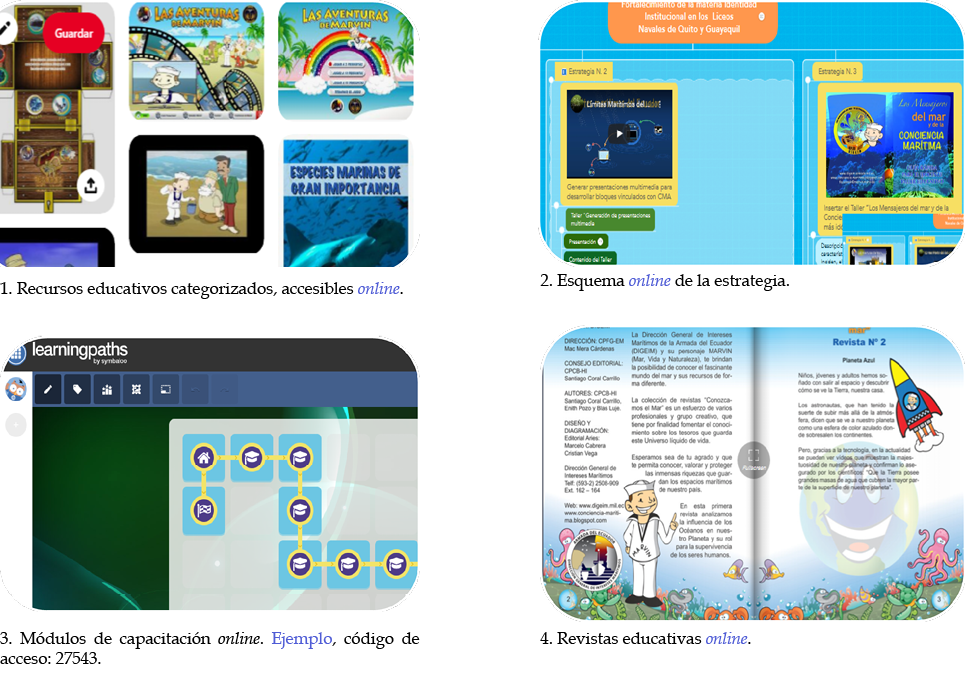 Históricamente los insumos educativos antes mencionados, en su gran mayoría eran poco difundidos y difíciles de acceder por su ubicación y formato; pretendiendo cambiar esta situación, en el año 2020, se realizó el proyecto ‘Herramientas digitales para la difusión y fortalecimiento de la Conciencia Marítima’, cuyos resultados principales constituyen la base para la redacción del presente artículo. Lo identificado en esta experiencia, es mucho más relevante, luego de las nuevas restricciones y necesidades que han demandado la nueva normalidad que la crisis de la COVID-19 ha producido, permitiendo un esfuerzo técnico positivo que se puede aprovechar en el accionar de la DIGEIM. Más información en torno a las tareas de la DIGEIM, se puede encontrar en su sitio web oficial: https://digeim.armada.mil.ec/