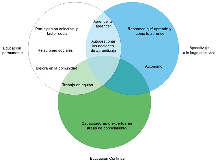 Las formas que han tomado la educación y el aprendizaje son diversas. Términos como andragogía o educación a distancia son hoy en día conceptos que han permeado en el imaginario colectivo y se han instalado en la terminología educativa. Tal proliferación de conceptos propicia que exista confusión semántica y se corre el riesgo de emplearlos de forma indiferenciada. Tal es el caso de la educación continua, educación permanente y aprendizaje a lo largo de la vida, conceptos que suelen asumirse erróneamente como sinónimos cuando existen acepciones que los alejan diametralmente. Sin embargo, existe entre ellos aproximaciones conceptuales que propician esta ambigüedad.