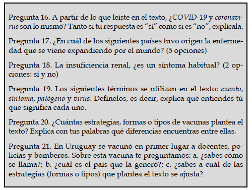 Se buscó aquí conectar la temática general del texto con la información sobre vacunación anti COVID-19 proporcionada por los medios de comunicación nacional y local. Para ello, se sondeó el nivel de información de los jóvenes acerca de noticias de la pandemia en el contexto nacional. Cuando se aplicó la prueba diagnóstica, Uruguay había comenzado la vacunación; se informaba a diario sobre el Plan Nacional que se estaba llevando adelante. Los primeros vacunados en el país fueron los docentes, policías y bomberos, con dosis de Sinovac, vacuna comprada a China. Esta información no se proporcionó en el texto de la prueba.