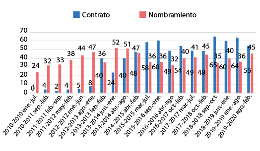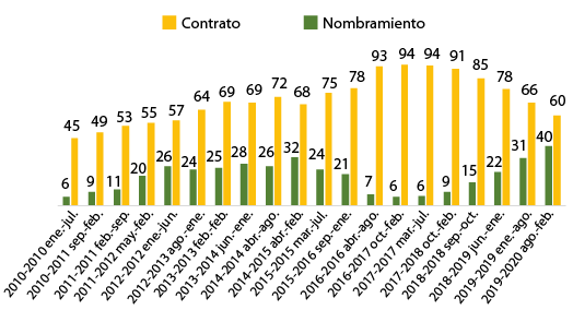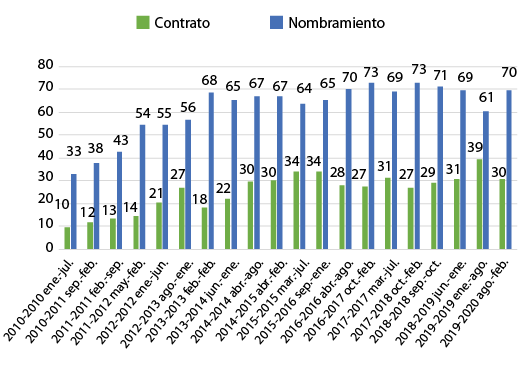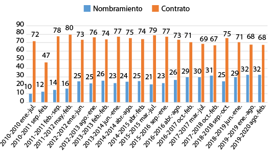A partir del año 2016, el porcentaje de nombramientos disminuyó cuatro puntos porcentuales; por su parte, entre 2010 y 2020, el porcentaje de contrataciones se elevó del 10 % al 32 %. Desafortunadamente, los datos de la relación laboral de contratos y nombramientos no se encuentran desglosados por sexo. Por tal motivo, no se pudo comparar cuál era la forma de relación laboral de las mujeres en esta facultad.