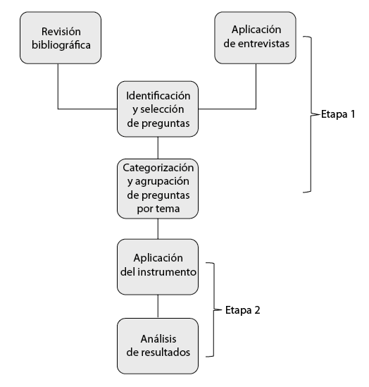 La metodología se desarrolló en dos etapas (figura 1). La primera consideró el levantamiento de información mediante la búsqueda y la revisión bibliográfica, entrevistas, indagación y propuesta de preguntas relacionadas con el tema de estudio; la segunda corresponde al trabajo desarrollado desde la aplicación de la encuesta hasta el análisis de los resultados.