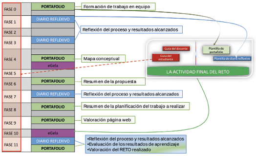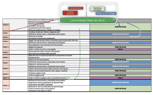 Por su parte, el diario reflexivo contiene una reflexión crítica por parte de cada estudiante acerca de las distintas fases por las que va avanzando, así como una evaluación de los resultados de aprendizaje individuales (cuestionario, valoración del resultado final del reto y reflexión individual acerca del proceso) realizada por cada estudiante.