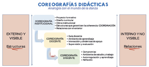 Utilizando la analogía de la danza, los pasos de ballet responden simultáneamente a dos tipos de demanda: por un lado, el bailarín puede crear libremente su baile en el espacio disponible y mostrar en él todo su repertorio expresivo; por otro, el artista se ve limitado por los elementos que constituyen la escenografía, la música, el ritmo, la estructura métrica, etc. Partiendo de este ejemplo, Oser y Baeriswyl (2001) desarrollan el enfoque de las coreografías didácticas, que Zabalza (2022) adapta a la realidad universitaria española.